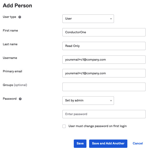 If desired, you can create a service account user in Okta that has the permissions for the API token.Enter the necessary user details to create a user. You might want to use identifiers that make it easily recognizable as a service account, such as First Name: ReadOnly, Last Name: ServiceUser.