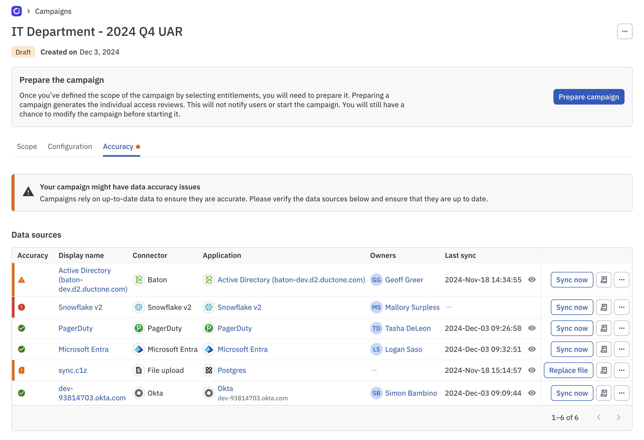 - Campaigns can now be configured to start and end automatically, eliminating the need for manual intervention. When a campaign is set to auto-start, we’ll review data accuracy before launch and notify campaign admins of any issues. You can choose whether campaigns should proceed automatically or wait for manual review when data issues are detected. Further details for how to set auto-start and auto-end on campaigns and templates can be found in Create an access review campaign.
